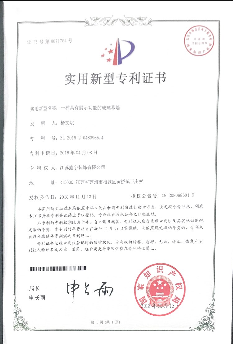 一種具有展示功能的玻璃幕墻實用新型專利證書